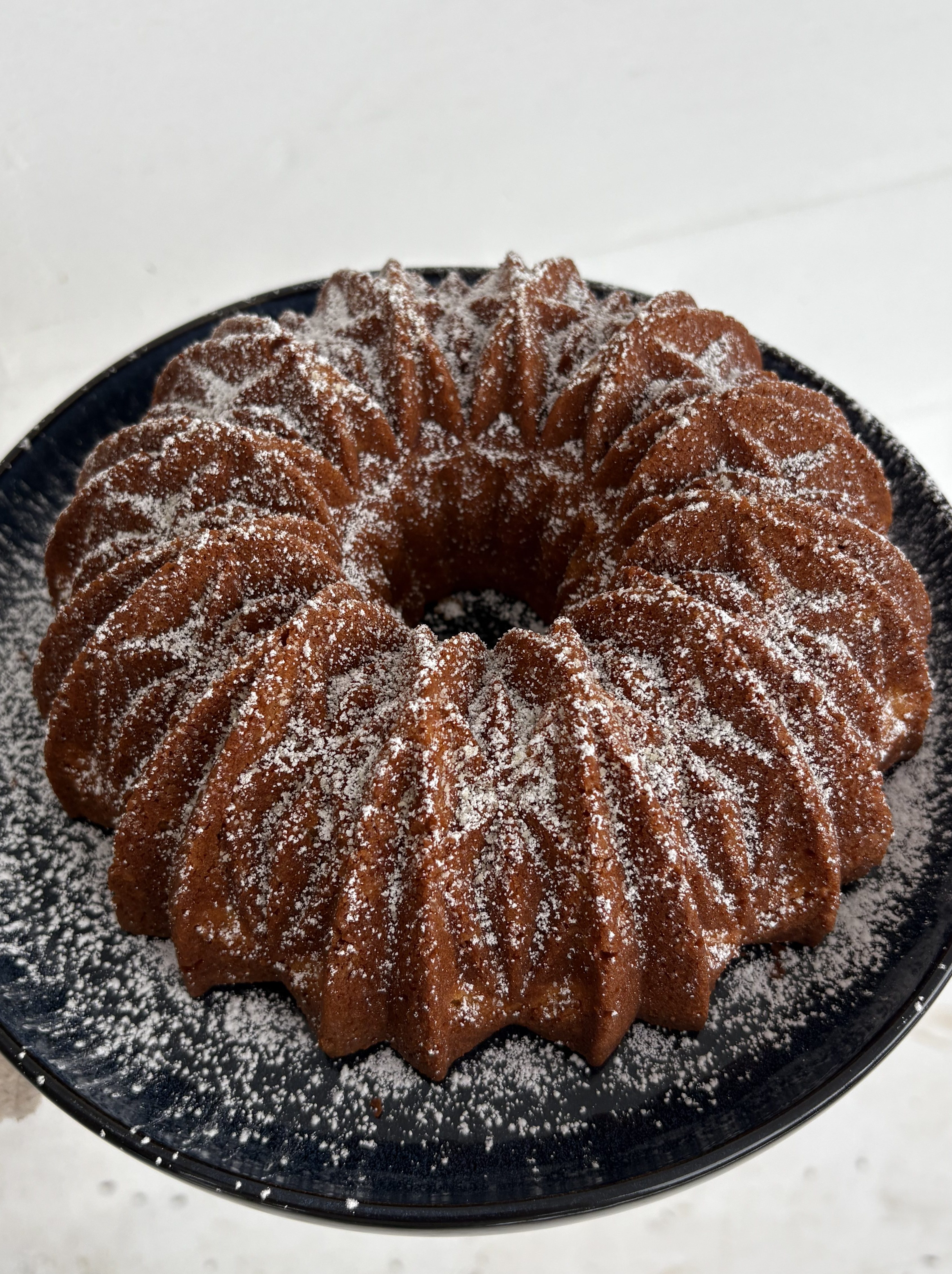 Once the cake is fully baked, pull it out of the oven and let it rest in the pan for 10 minutes. Then place a plate on the top of the pan and invert the cake onto the serving plate. Once the cake is released and free from the pan, let it cool as much as desired, dust with powdered sugar, and enjoy!